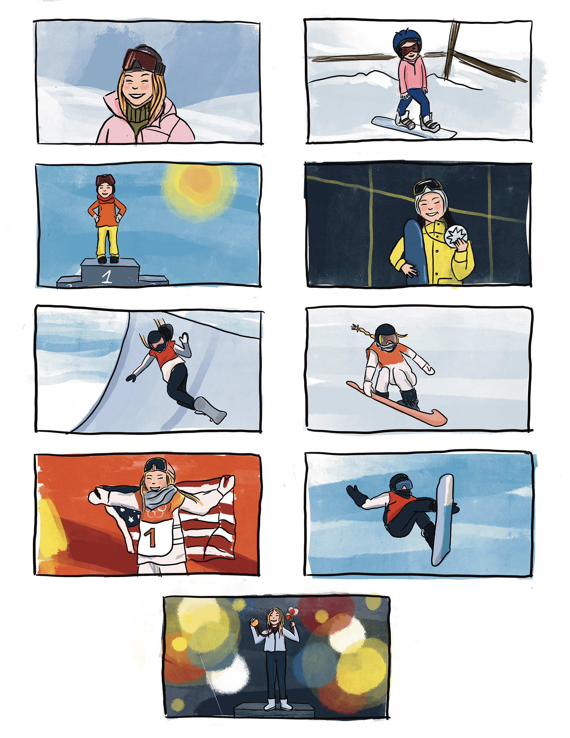 Storyboard and illustrations for Chloe Kim Snowboarding Star, a children's story from Lalilo by Renaissance, an E-Learning provider of educational online books.